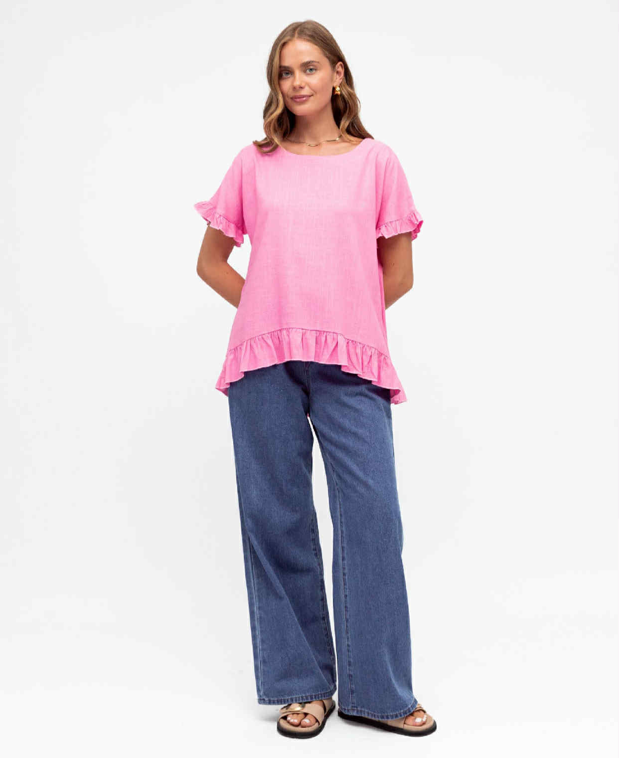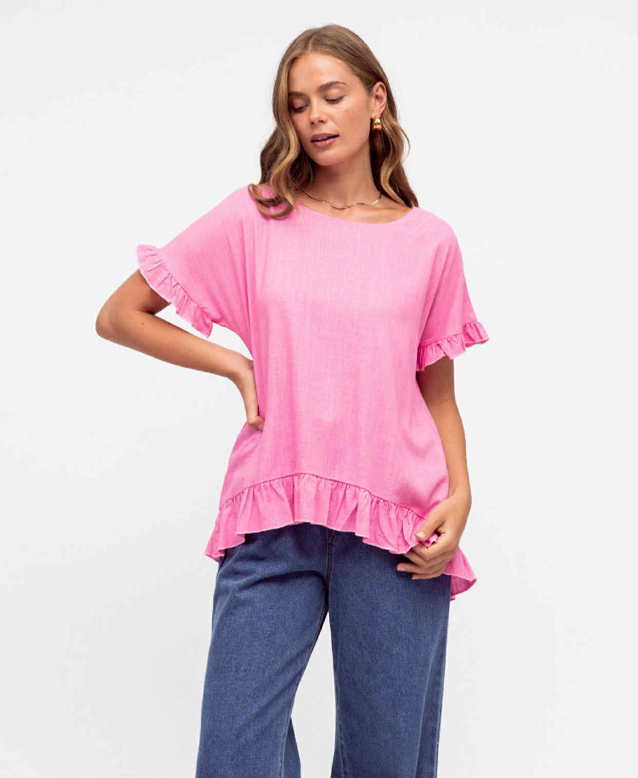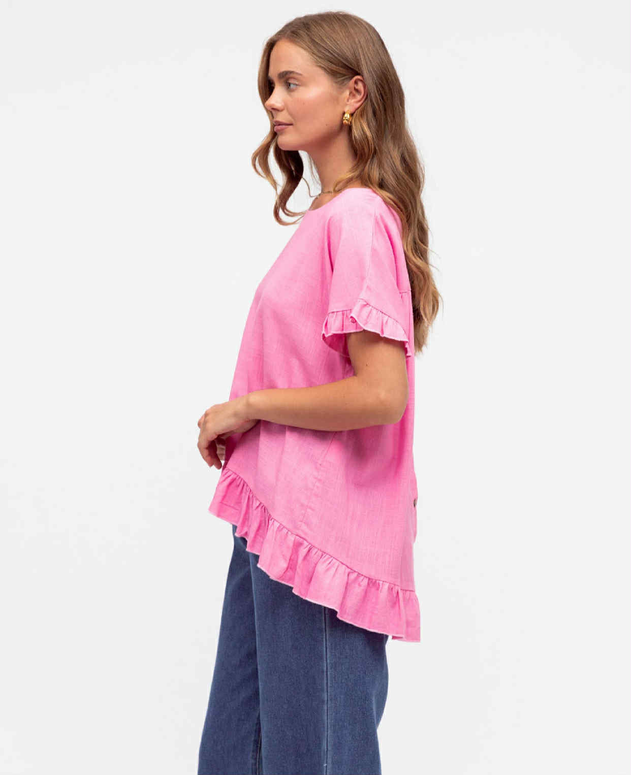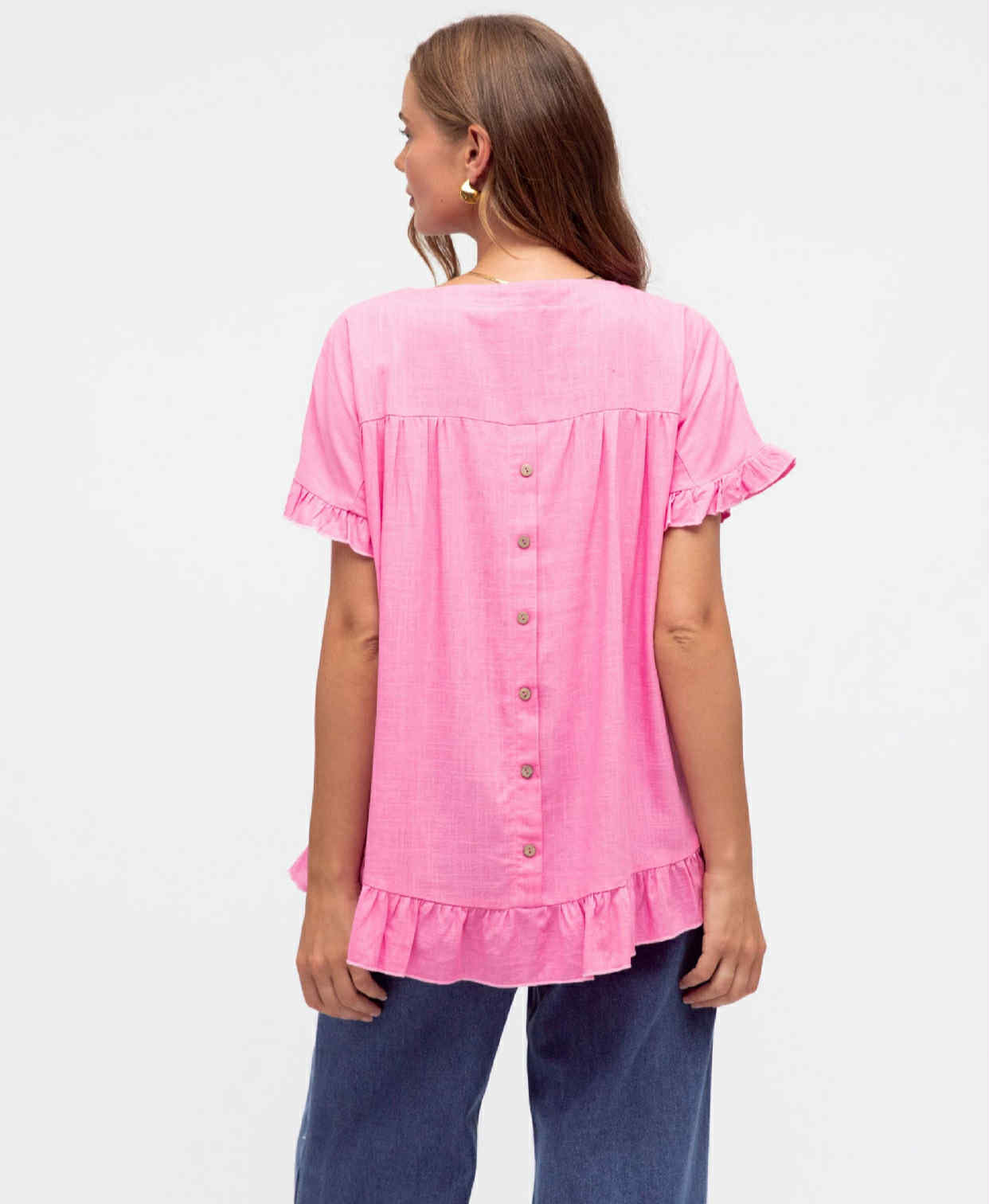 Candy pink sweet top with button detail down the back, slight hi-Lo length, ruffle sleeve and hem.