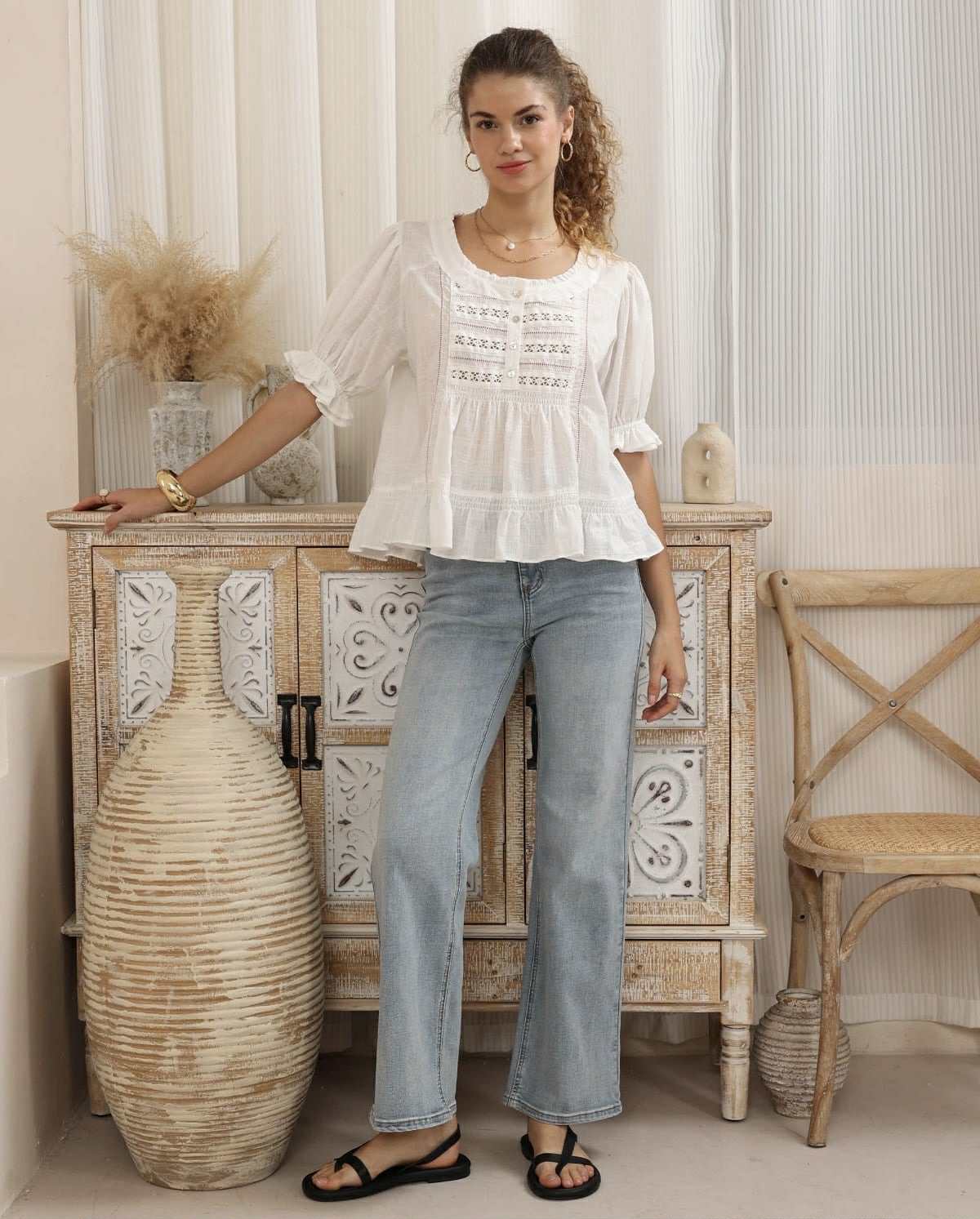 what a delightful summery shirt. its so sweet with the frill sleeves & lovely lace detail to the front, with a lose scoop neckline & frilly hemline its a great shape to wear with pants or jeans and can be dressed up or down. it has a fine red stitching to the front so could also look lovey for Christmas.