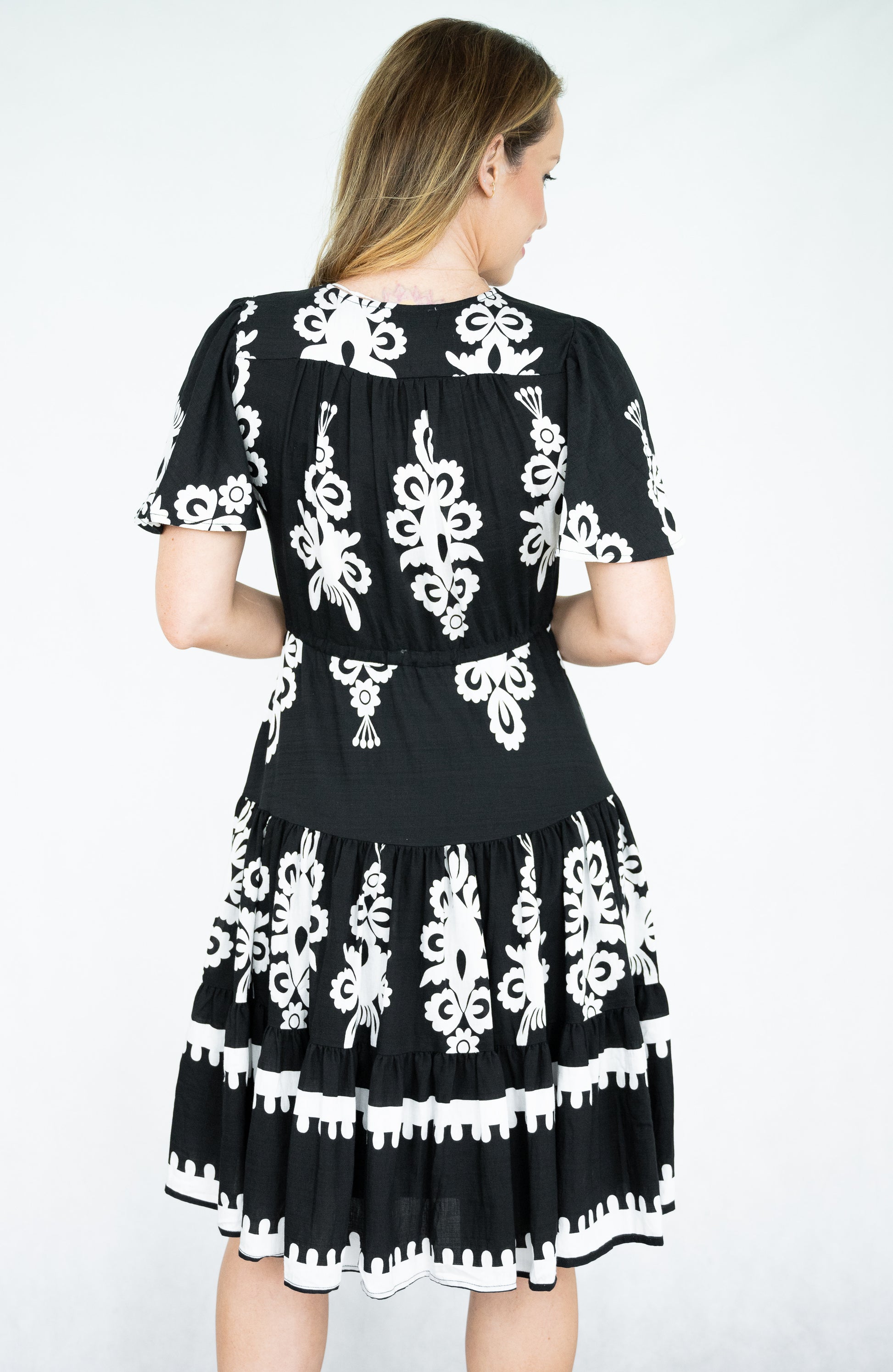 Such a lovely summery style dress with gorgeous floaty sleeves & skirt. The buttons to the front and tie to the middle allow you to pull it in giving you a nice waistline and shape to the bust. The skirt is fully lined.