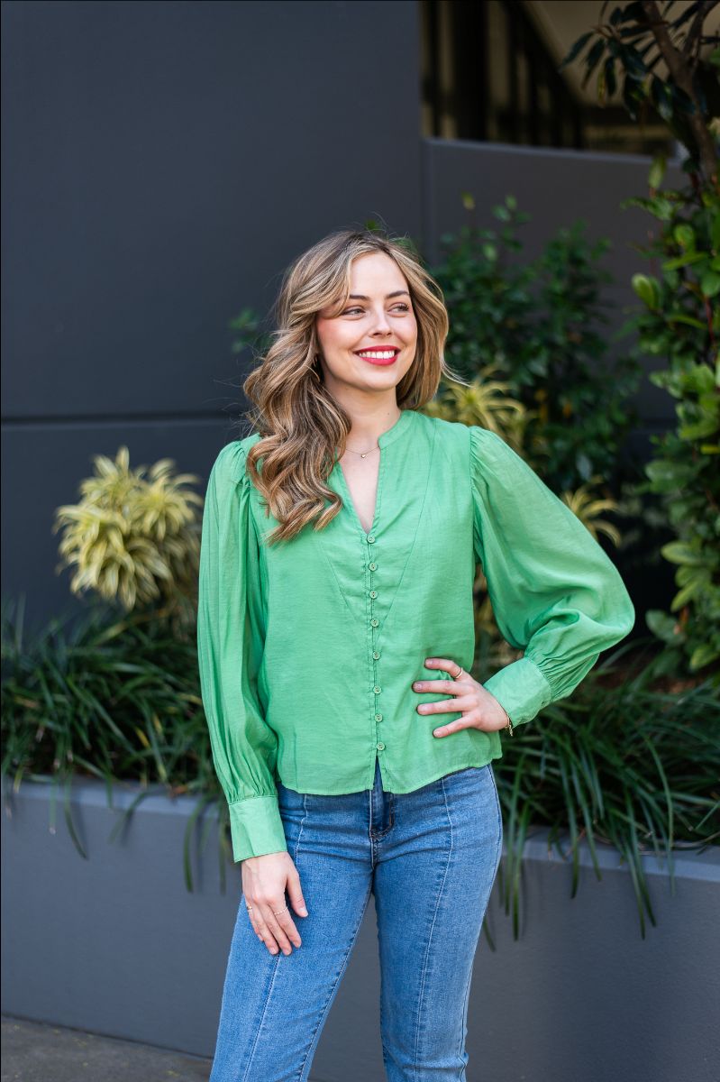 Such a simple shirt. We love the colour is so uplifting to wear. The VNeck is a winner and the button front & sleeve detail. It is a shorter style to wear back with high waisted pants or skirts. It’s also fully lined