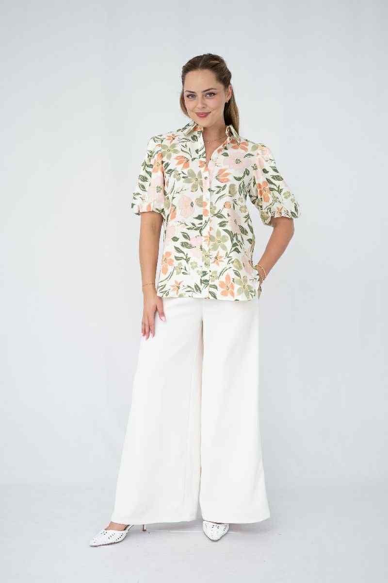 Soft pastel floral blouse, buttoned through with a sweet puff sleeve and a slight pleat in the back for extra comfort.