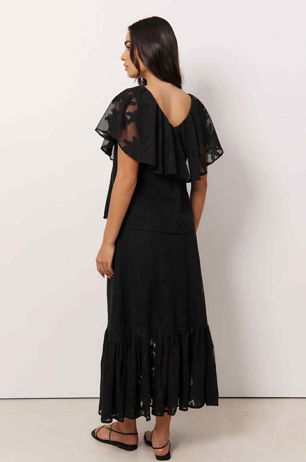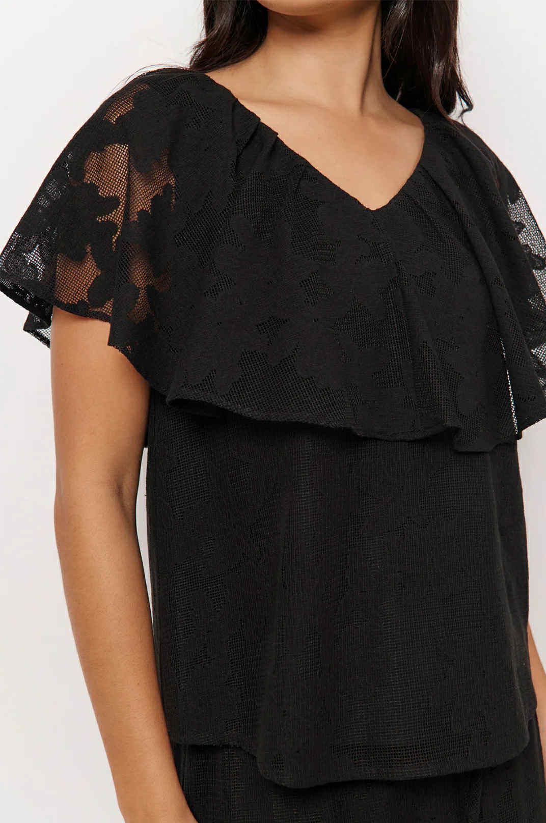 This is a lovely lacy top with a V front and back and a flutter layer over the shoulders and bodice. This is a great piece to add to your wardrobe, team it with pants or a skirt it is a real stand out.