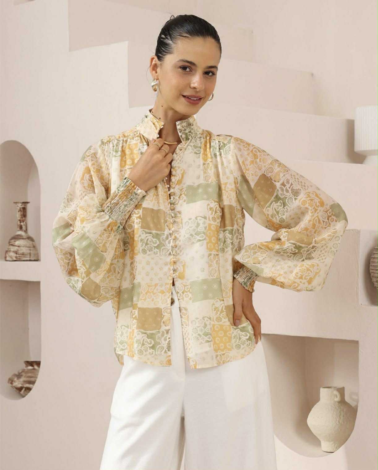 This gorgeous yellow and green printed shirt has a lovely button detail all the way down the front with gorgeous oversized puff sleeves with ruched cuffs and a stunning ruched high neckline for a dressier look. It looks really smart with jeans or dressier linen pants, it’s a lovely hand feel fabric.