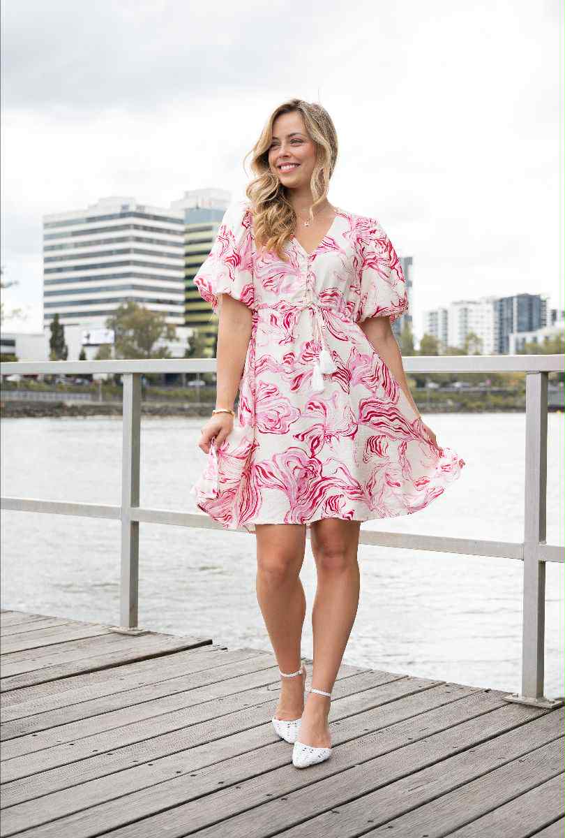 Stunning pink and ivory swirl patterned dress with a puff sleeve, gold buttons on the bodice and a tie waist. A gorgeous summer addition to your wardrobe for the festive season!