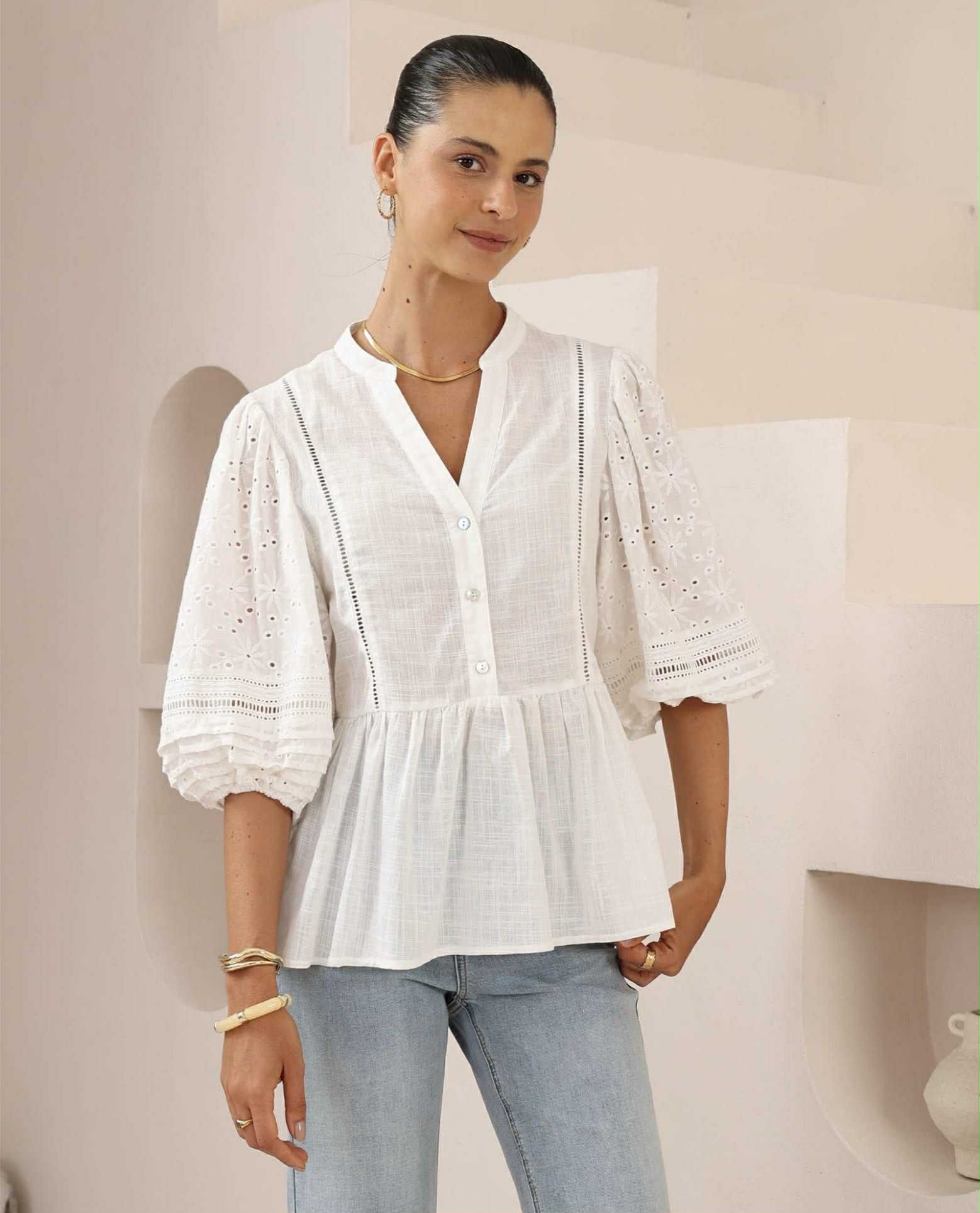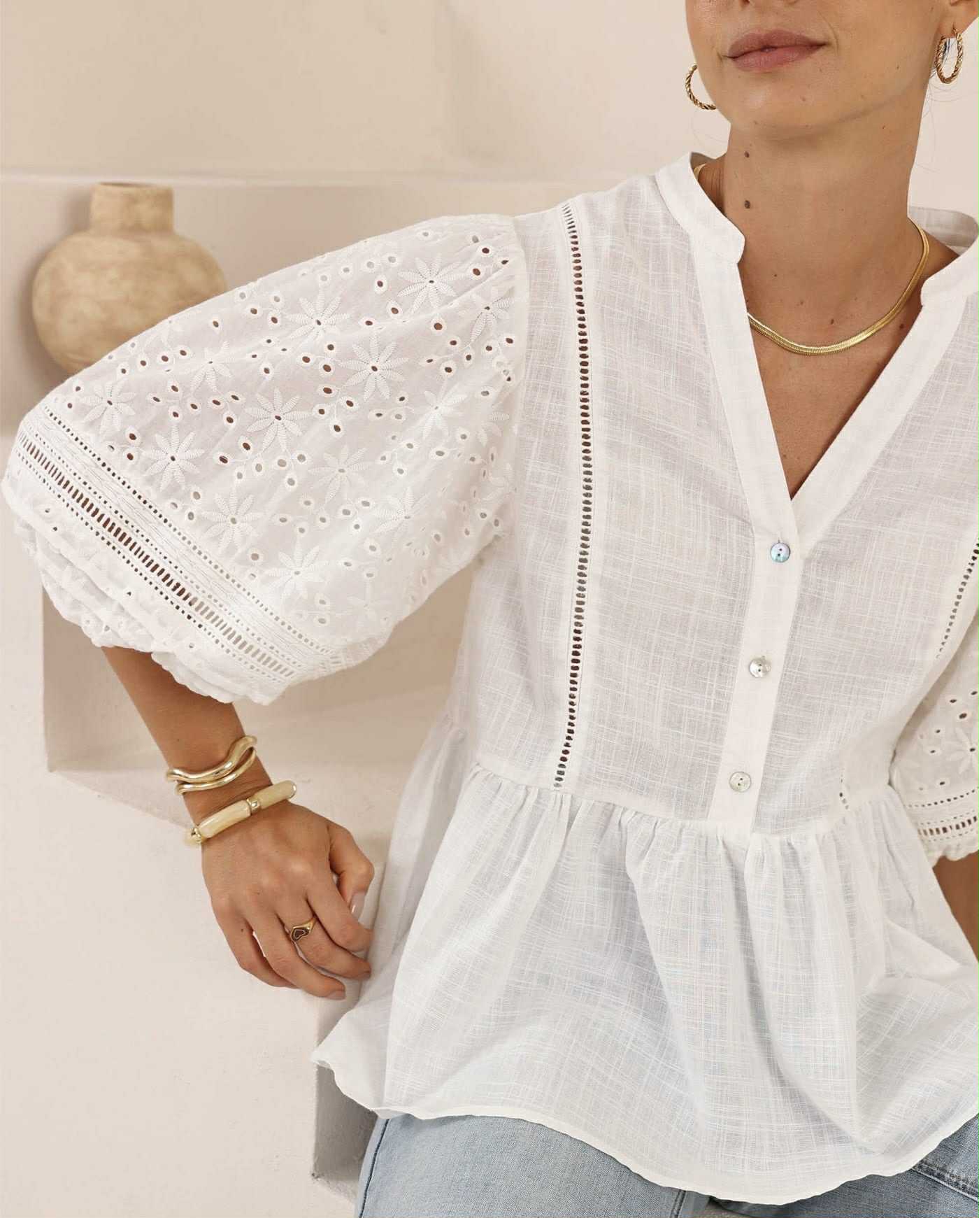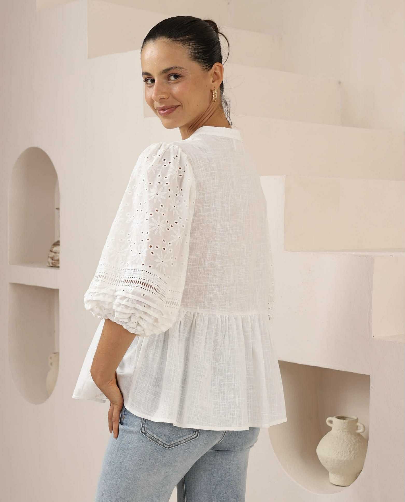 A sweet baby doll style, 100% white Cotton top with Broderie Anglaise sleeves. Perfect to pair back with your favourite jeans.