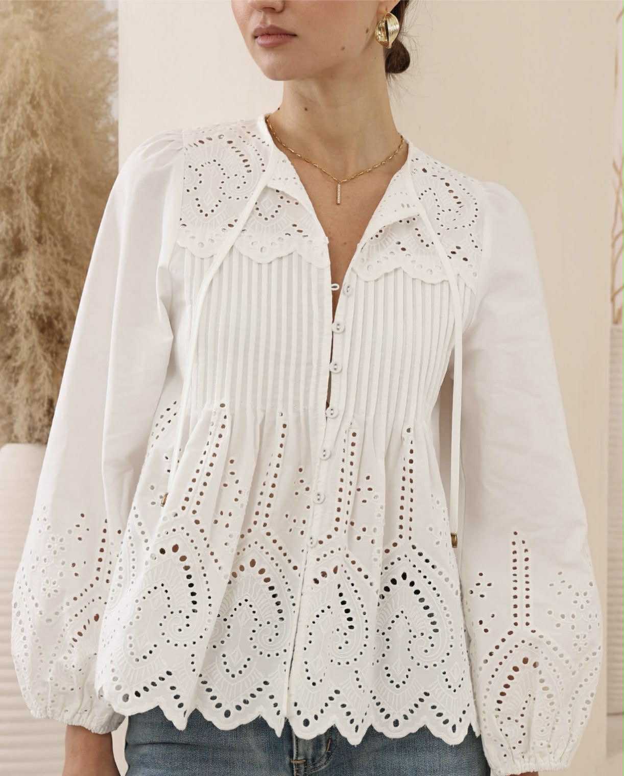 Gorgeous white lace detail and a V neckline and tie makes this top your go to for the work place or the weekend. Long puff elasticized sleeve and relaxed fit.