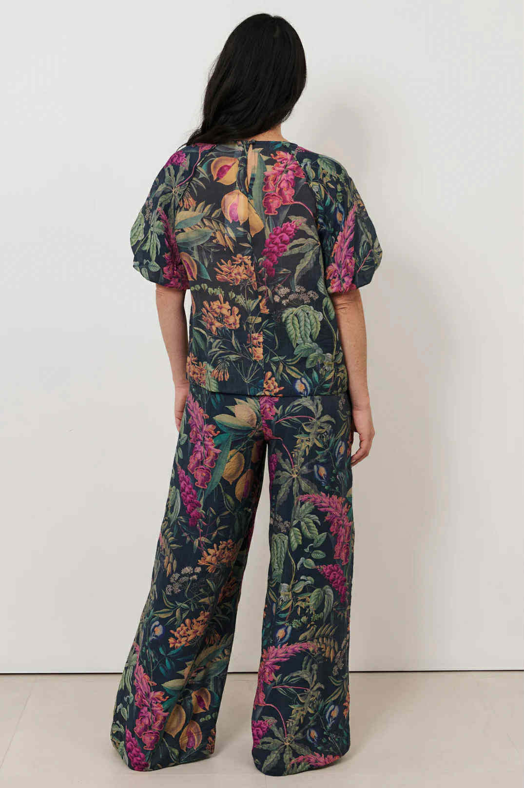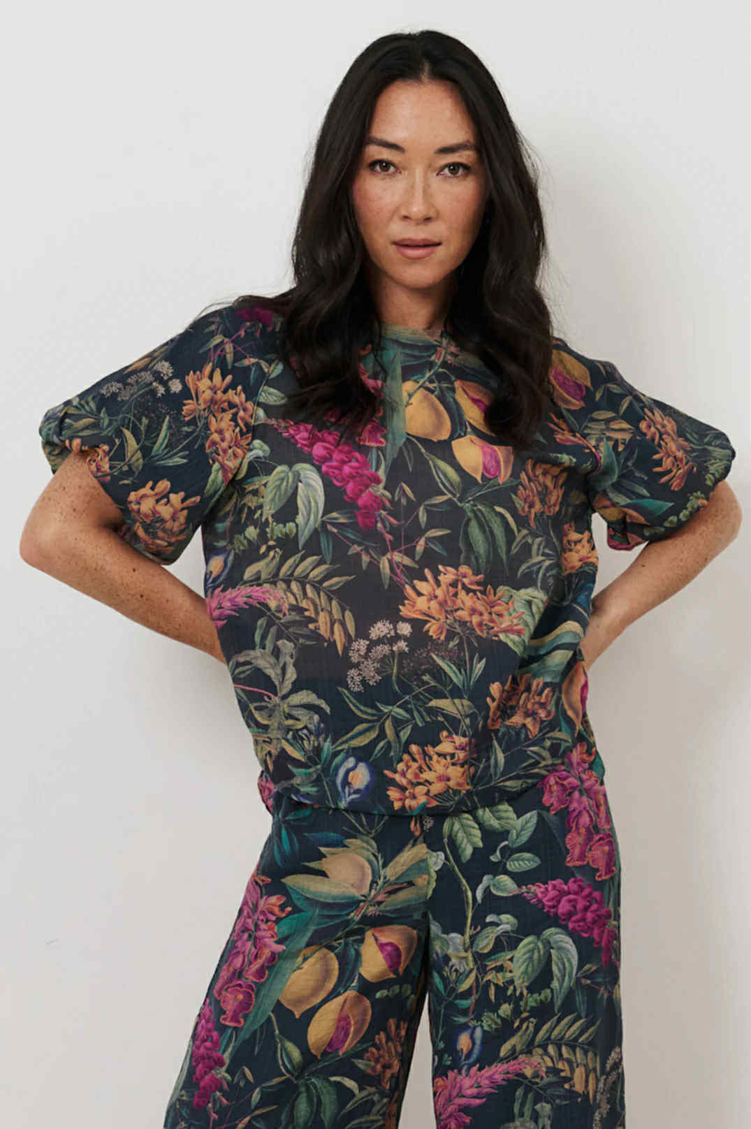 This top features a beautiful delicate fabric and pretty botanical print in gorgeous subtle colours. It is perfect worn out, sitting on the hip teamed with a multitude of coloured coordinates. The sleeves are gathered in to create a fuller soft look.